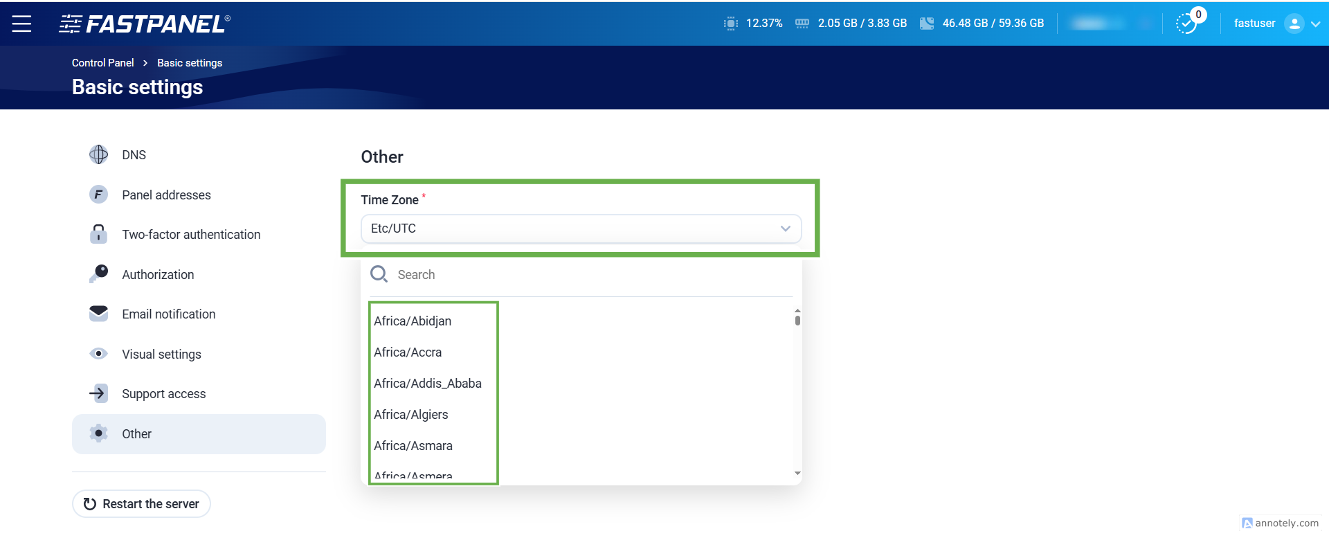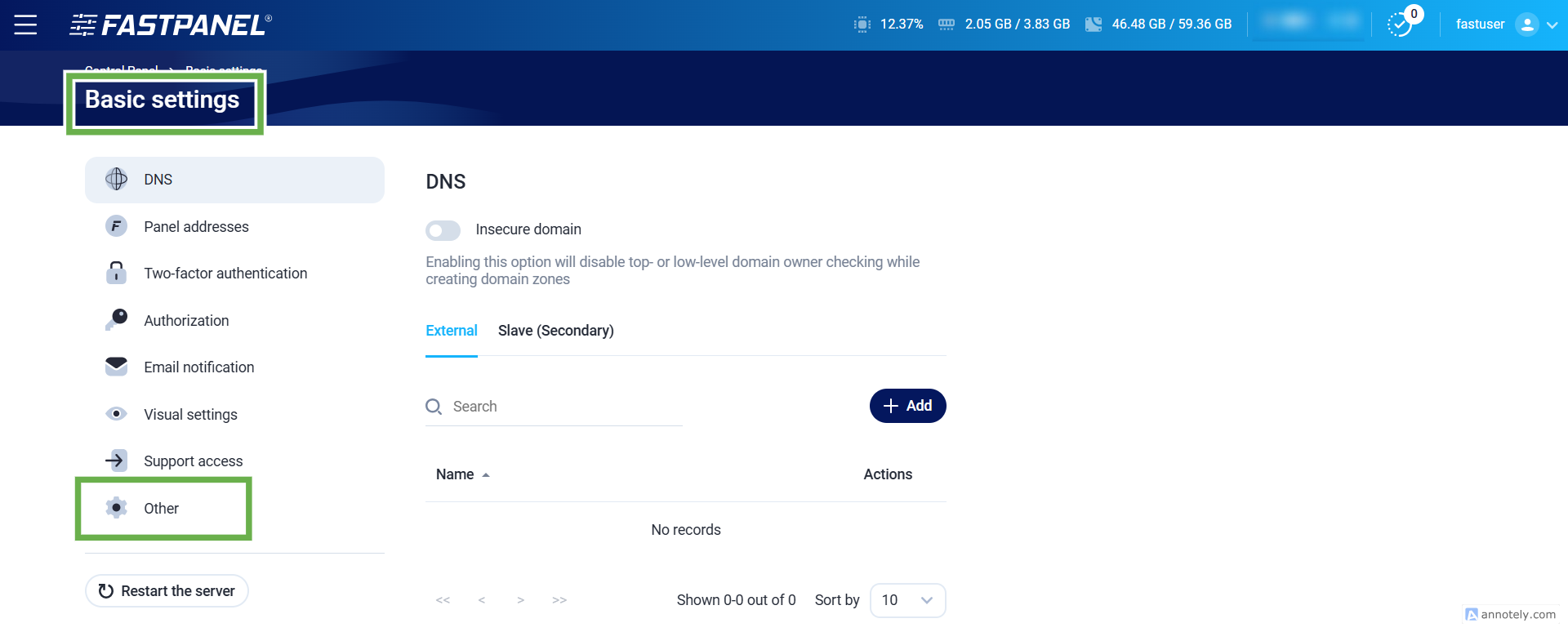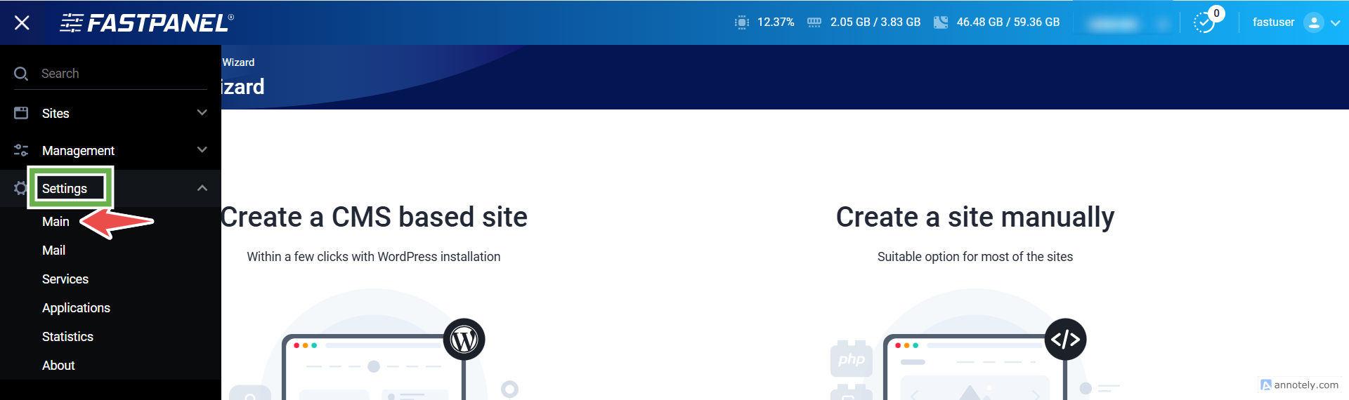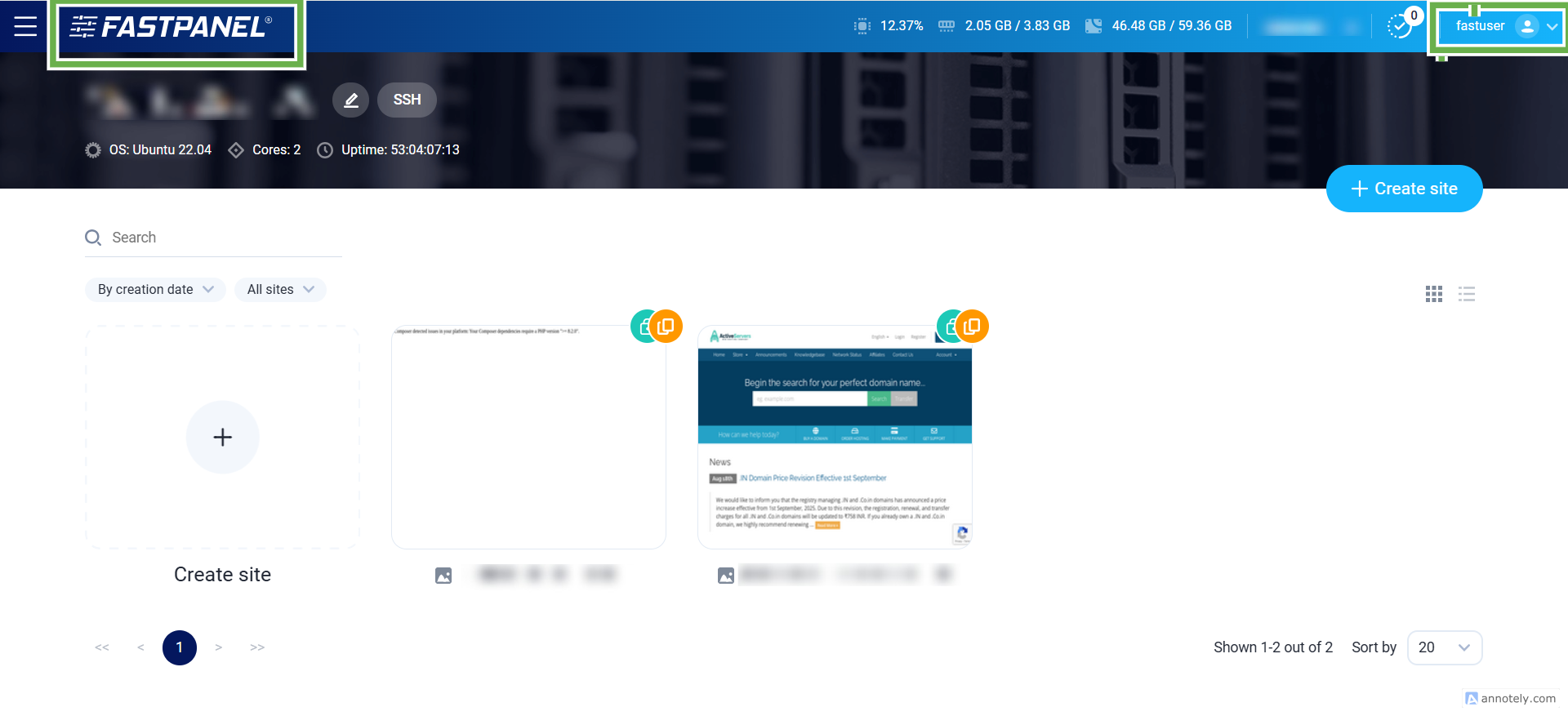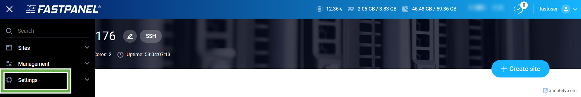 Open your FastPanel dashboard using your server’s URL (usually something like https://your-server-ip:8888) and log in with your admin credentials.